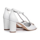 Aceste sandale au tocul inalt si gros, ceea ce te ajuta sa te simti cat mai confortabil pe parcursul evenimentului. Partea de sus este din piele naturala alba, iar varful este decupat. Pe partea din fata, sandalele sunt ornate cu o funda dubla, din material texturat, auriu. Tocul este imbracat in acelasi material auriu texturat ca si funda.